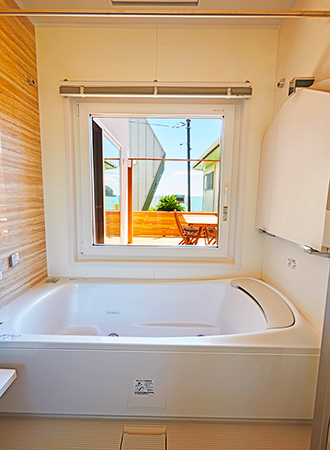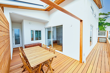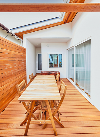 リビングからつながるウッドデッキは、敷地内にいながらも外の空気を感じられる癒しのスペースとなっています。