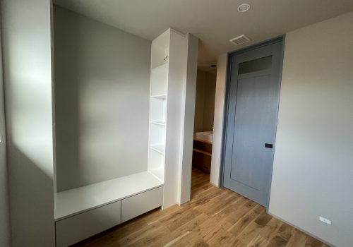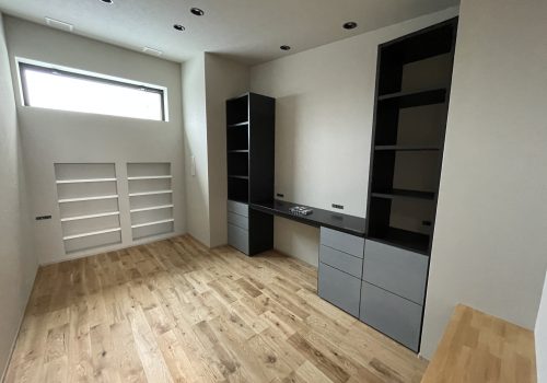 造り付けのデスク、造り付けベンチ、壁を利用して、単行本などちょっとしたものが置けるニッチ