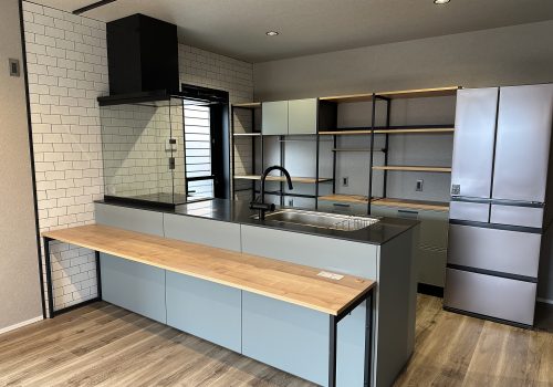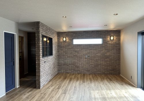 玄関とリビングを隔てる壁にはレンガ調のタイルを貼りました◎