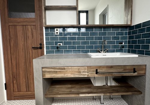 レンガの壁、タイルやモールテックスを使用した造作洗面
